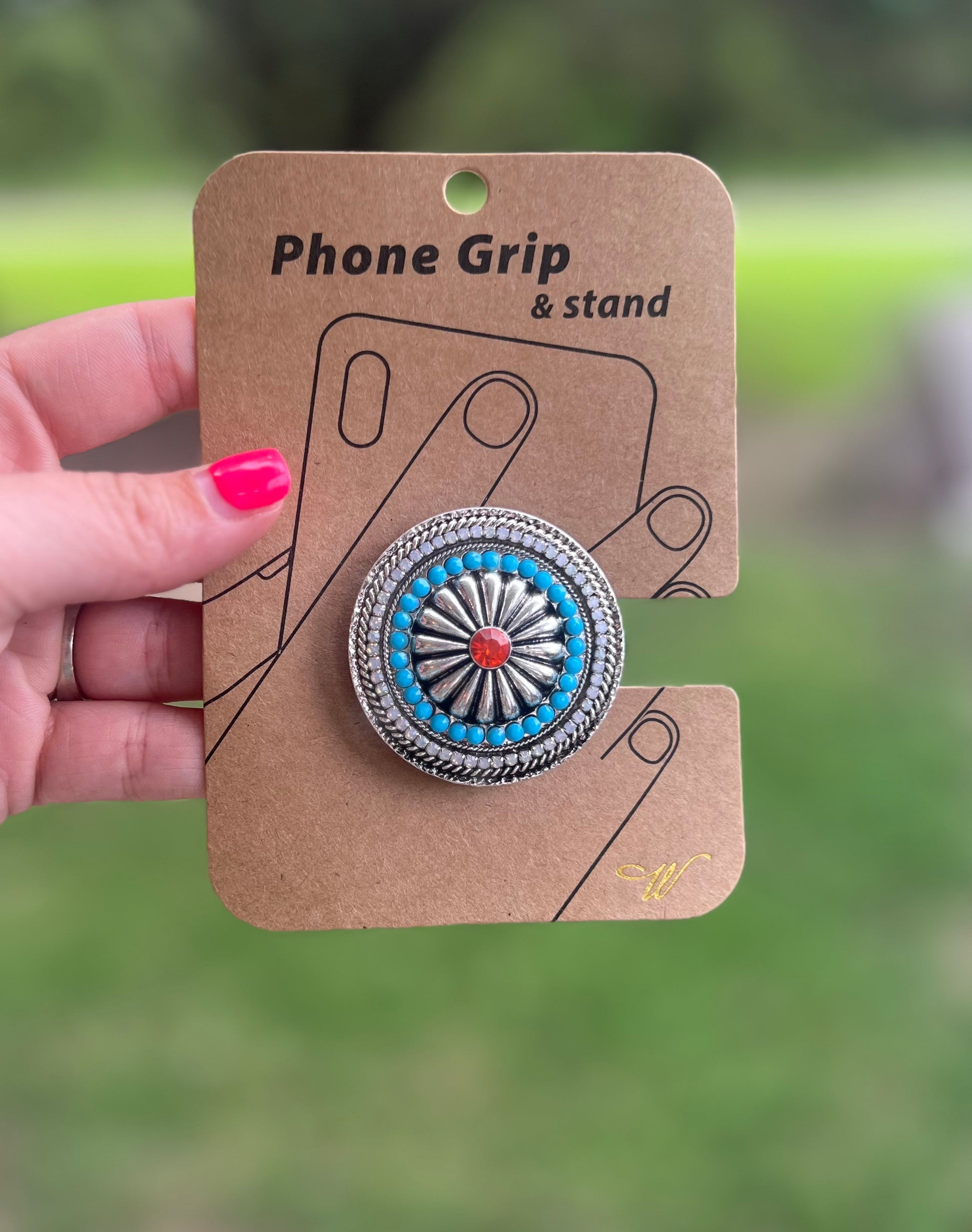 Blue bejeweled silver tone concho phone grip
